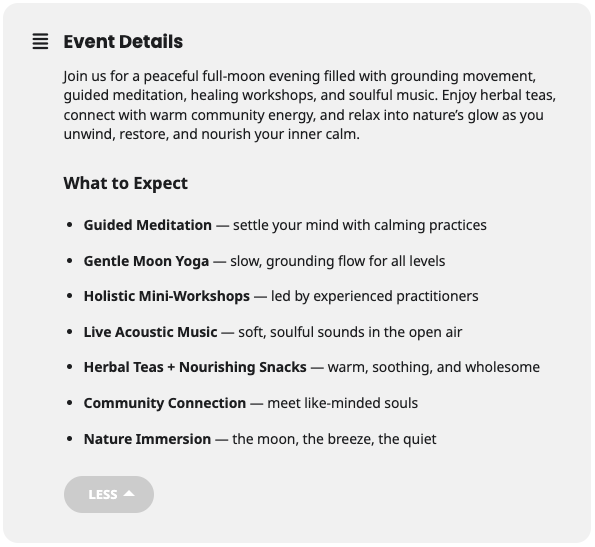 Enhance basic event lists with dynamic layouts, past/future filters, and customizable sorting.