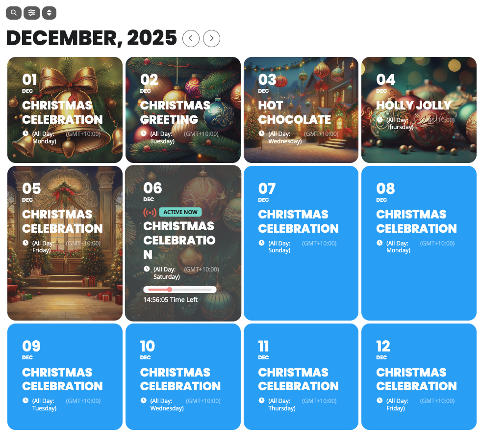 Set events as advent days — hide details before, reveal content on the date, and control what shows after. Perfect for countdowns, promotions, or holiday fun.