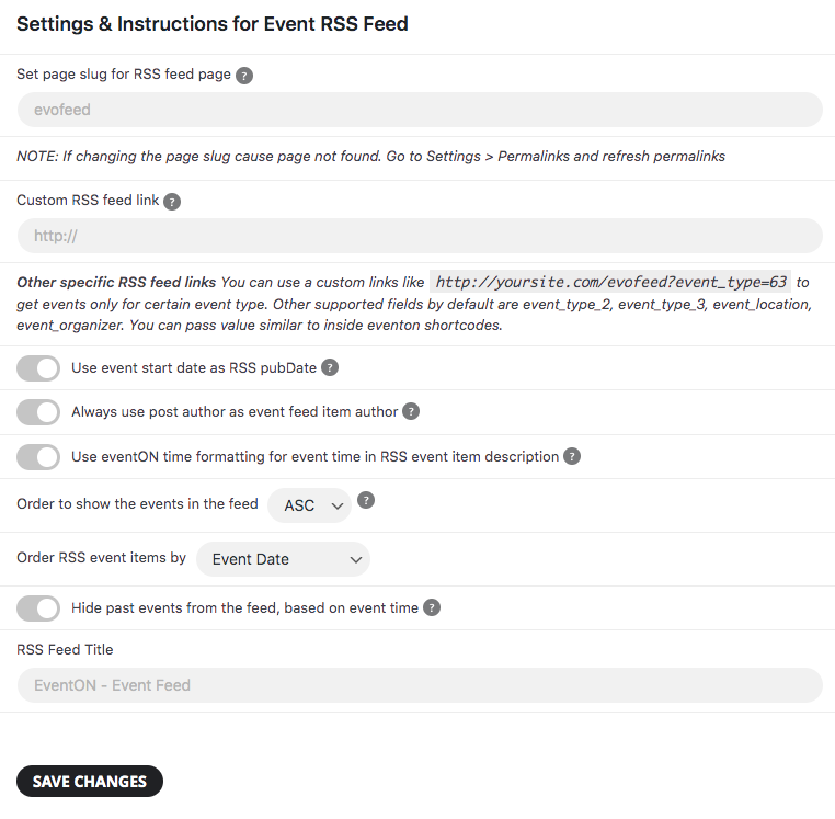 Customize the RSS feed settings to fit your desired values using the various available options. You can also customize the feed main URL and generate event type based urls.