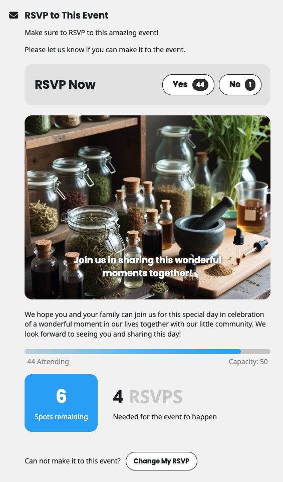 If your event need at least certain number of people for it to happen, set minimum event happening rsvp count easily, and this will also be visible for guests.