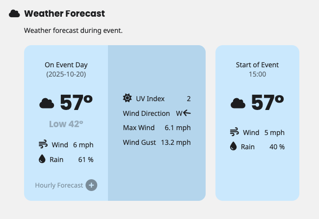 Plan flawlessly, thrill attendees, and turn weather woes into wow moments. Weather the storm—seamlessly by including weather info in events.